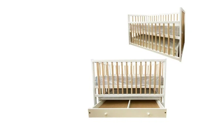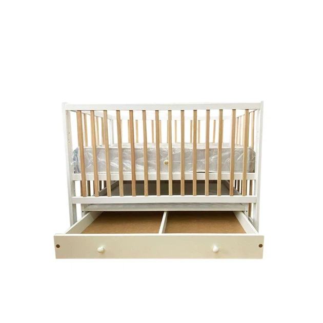 Дитяче ліжечко "Софія" з опускною боковиною, маятником на підшипниках та ящиком, білий колір із натуральними елементами