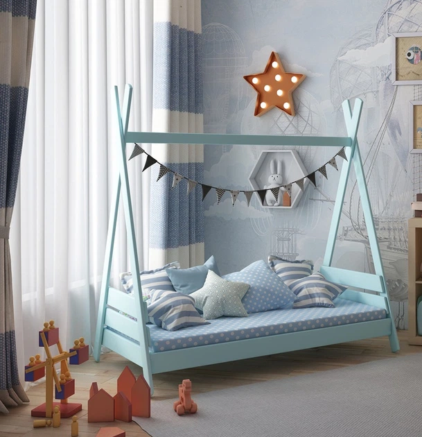 Ліжко-будиночок з натурального дерева сосна Дрім 80x160 блакитний Stemma
