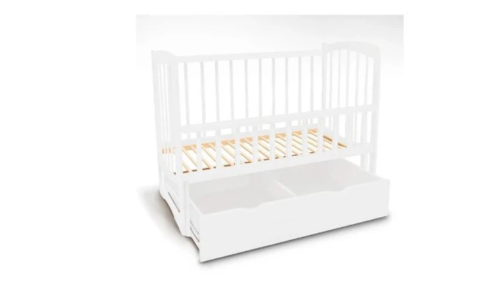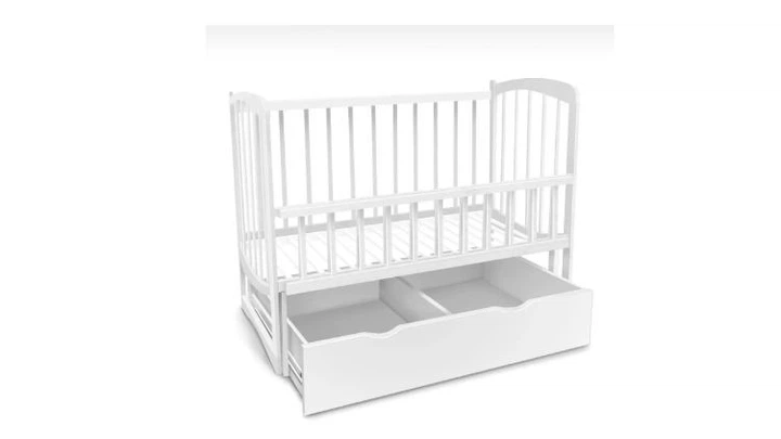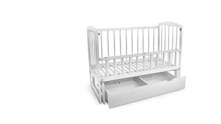 Дерев'яне дитяче ліжечко "Комета" з маятником, шухлядою та відкидним бортом, біле (вільха)