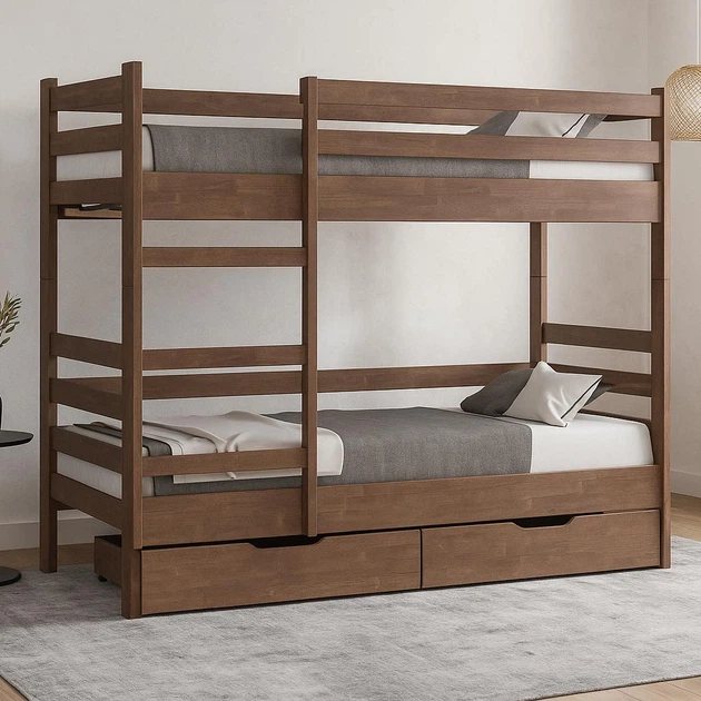 Дитяче двох'ярусне ліжко дерев'яне з масиву бука 80х190 см у кольорі горіх з двома шухлядами з ламелями для двох дітей дівча