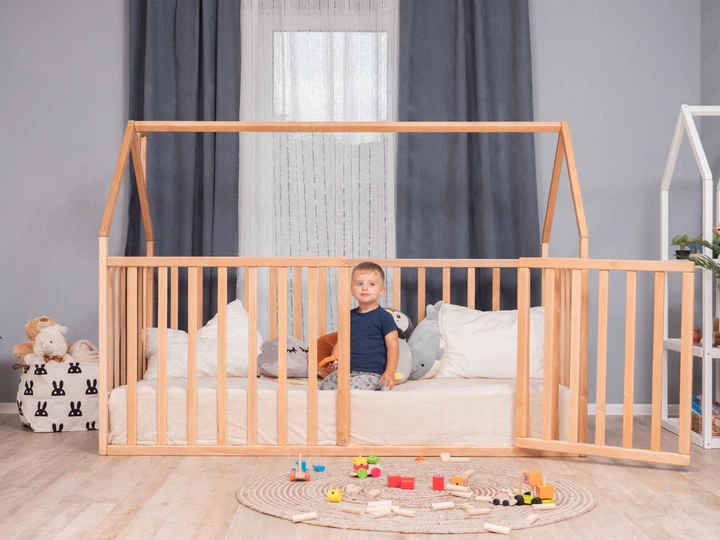 Дитячий дерев'яний манеж-ліжко будиночок Монтессорі BUSY WOOD на підлозі Модель 6 190x80 см Сірий