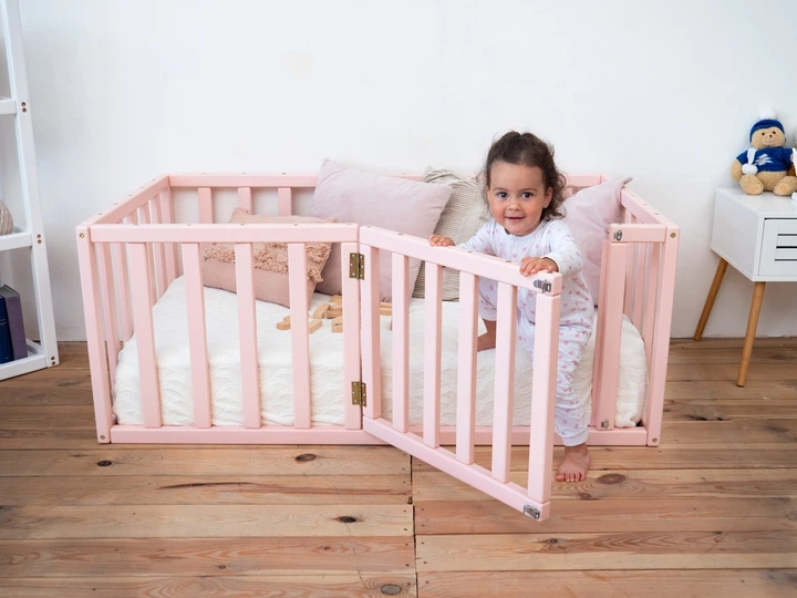 Дитячий дерев'яний манеж-ліжко для гри та сну Монтессорі BUSY WOOD Модель 6.2 120х60 см Рожевий