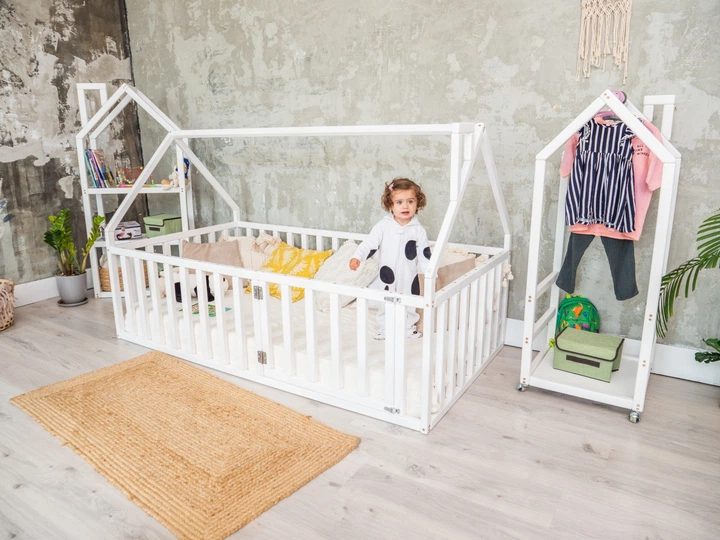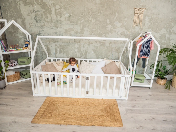 Дитячий дерев'яний манеж-ліжко будиночок Монтессорі BUSY WOOD на підлозі Модель 6 190x80 см Білий
