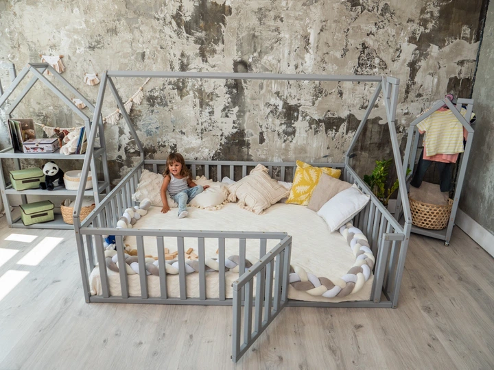Дитячий дерев'яний манеж-ліжко будиночок Монтессорі BUSY WOOD на підлозі Модель 6 190х140 см Сірий