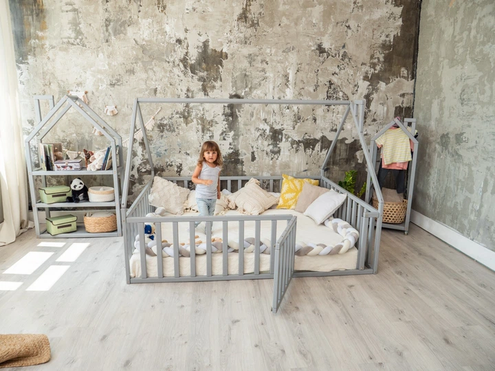 Дитячий дерев'яний манеж-ліжко будиночок Монтессорі BUSY WOOD на підлозі Модель 6 190x80 см Сірий
