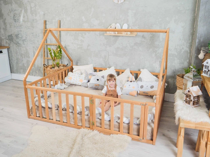 Дитячий дерев'яний манеж-ліжко будиночок Монтессорі BUSY WOOD на підлозі Модель 6 190x80 см натуральне дерево
