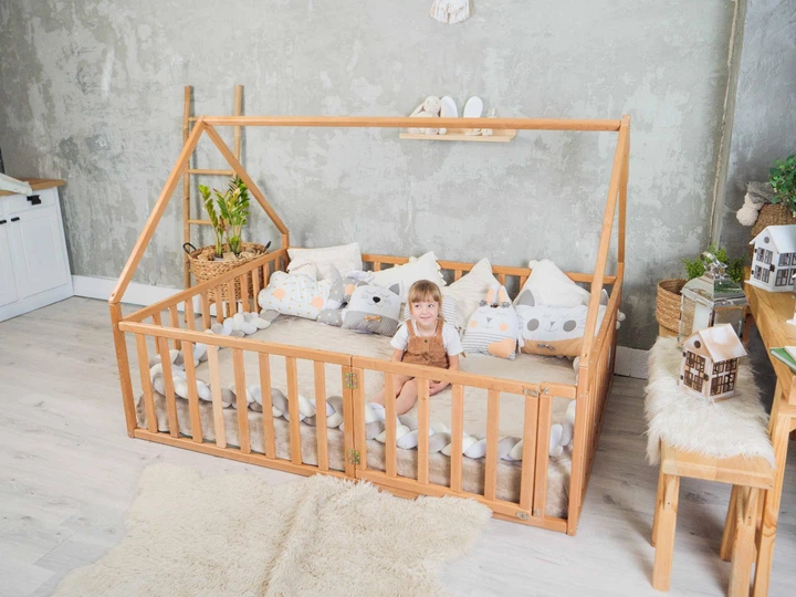Дитячий дерев'яний манеж-ліжко будиночок Монтессорі BUSY WOOD на підлозі Модель 6 200х140 см натуральне дерево