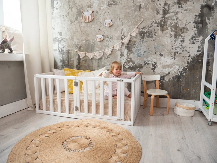 Дитячий дерев'яний манеж-ліжечко Монтессорі BUSY WOOD на підлозі Модель 6.2 140x90 см Білий