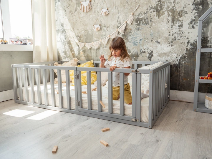 Дитячий дерев'яний манеж-ліжечко Монтессорі BUSY WOOD на підлозі Модель 6.2 160x90 см Сірий