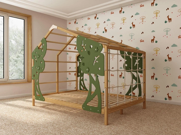 Дитяче дерев’яне ліжко "Форест" від Монтессорі з ніжками та з ламелями 200х140 см Натуральне дерево+Зелений