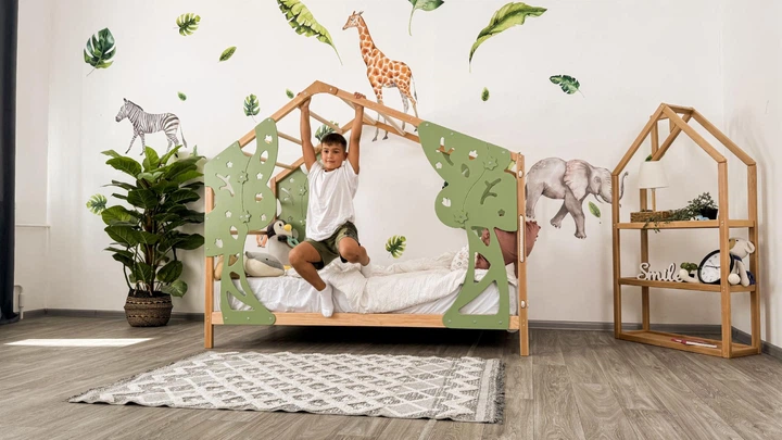 Дитяче дерев’яне ліжко "Форест" від Монтессорі з ніжками та з ламелями 190х90 см Натуральне дерево+Зелений