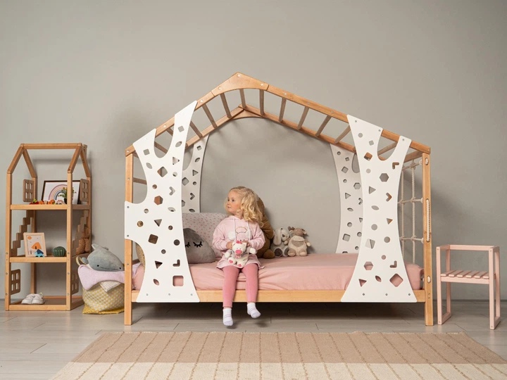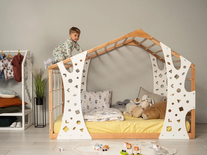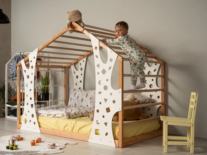 Дитяче дерев’яне ліжко "Monkey" від Монтессорі без ніжок із ламелями 190х90 см Натуральне дерево+Білий