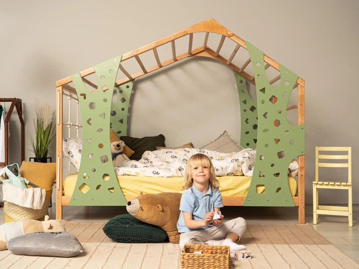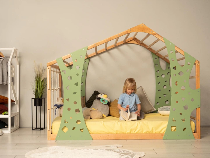 Дитяче дерев’яне ліжко "Monkey" від Монтессорі без ніжок та без ламелей 190х90 см Натуральне дерево+Зелений
