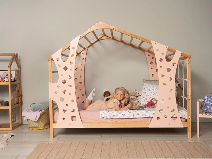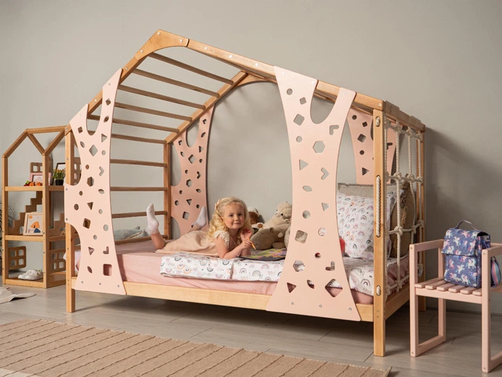 Дитяче дерев’яне ліжко "Monkey" від Монтессорі без ніжок із ламелями 200х90 см Натуральне дерево+Рожевий