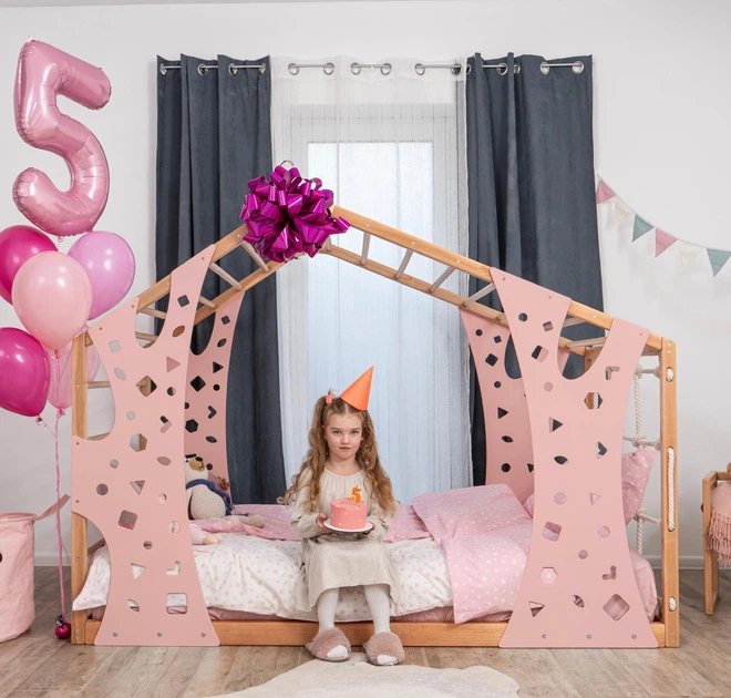 Дитяче дерев’яне ліжко "Monkey" від Монтессорі без ніжок та без ламелей 190х90 см Натуральне дерево+Рожевий