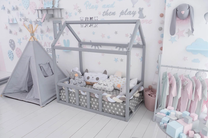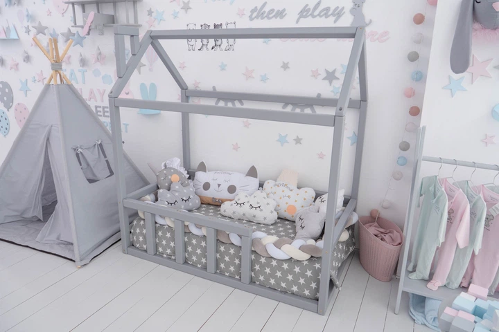 Дитяче ліжко будиночок Монтессорі BUSY WOOD підлогове з ламелями Модель 2 140х70 см сіра