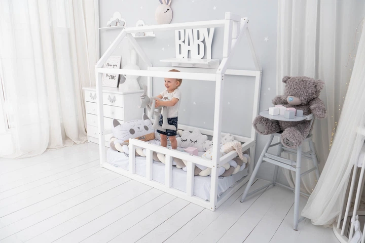 Дитяче ліжко будиночок Монтессорі BUSY WOOD на підлозі з ламелями Модель 2 120х60 см біле