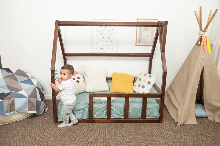Дитяче ліжко будиночок Монтессорі BUSY WOOD на підлозі з ламелями Модель 1 120х60 см темне