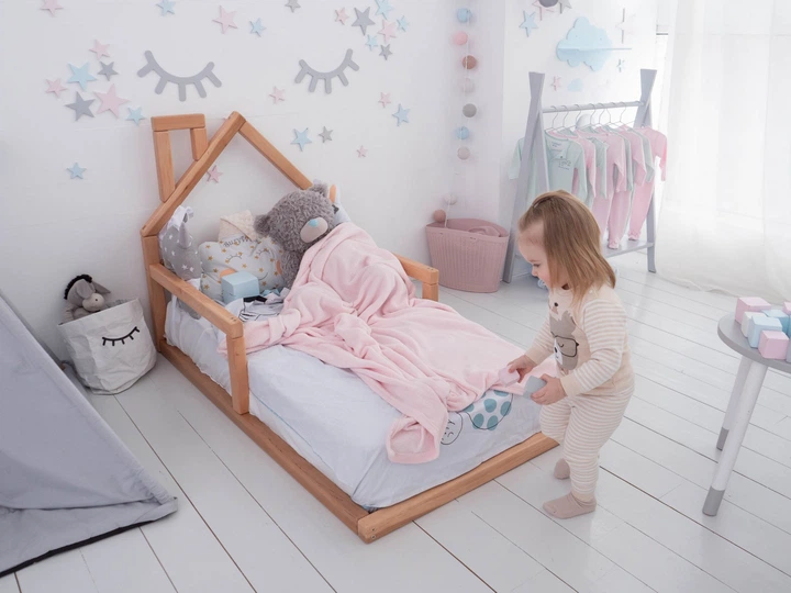 Дитяче ліжко будиночок Монтессорі BUSY WOOD на підлозі з ламелями Модель 2 160x70 см натуральне дерево