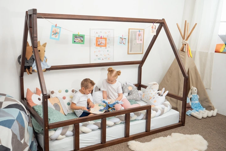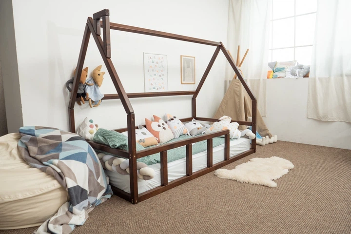Дитяче ліжко будиночок Монтессорі BUSY WOOD на підлозі Модель 1 200х140 см темне дерево