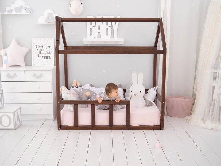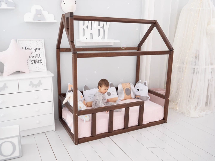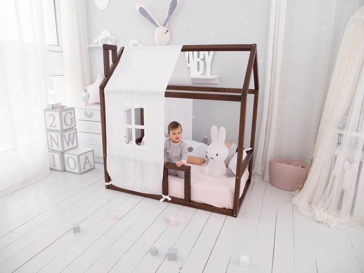 Дитяче ліжко будиночок Монтессорі BUSY WOOD на підлозі Модель 2 140х90 см темне дерево