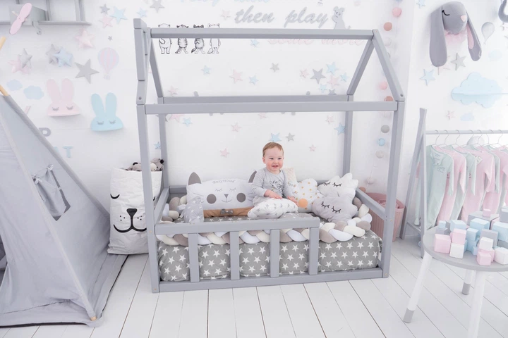 Дитяче ліжко будиночок Монтессорі BUSY WOOD на підлозі Модель 2 140х90 см сірий