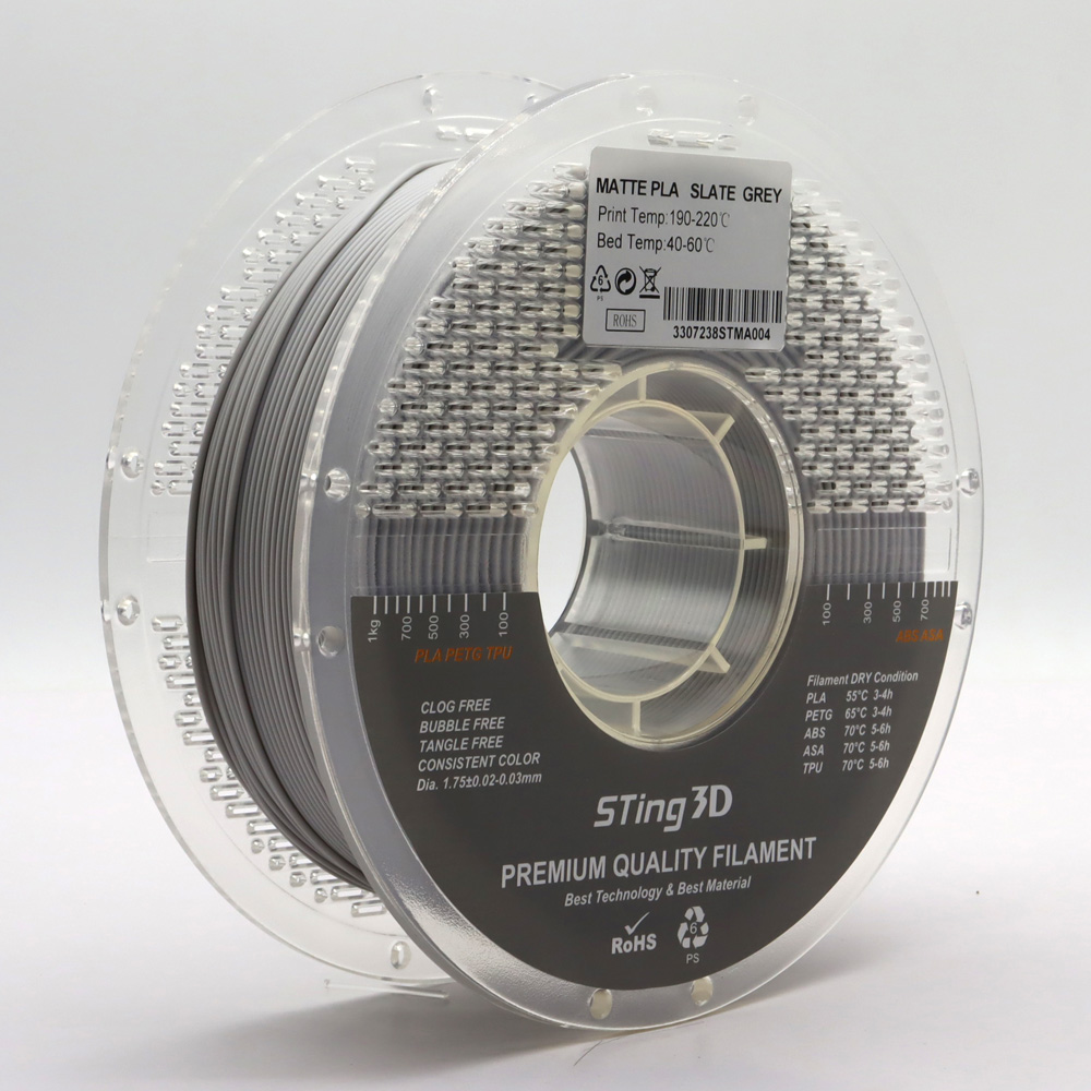 Відкрийте для себе нові горизонти 3D-друку з філаментом STing3D Matte у насиченому сланцевому кольорі. Цей PLA пластик поєднує матову текстуру та точність друку, забезпечуючи професійний результат навіть на побутових FDM-принтерах. Ідеально підходить для дизайнерів, інженерів та ентузіастів, які потребують: Глибокий сірий сланцевий матовий відтінок для стильних моделей