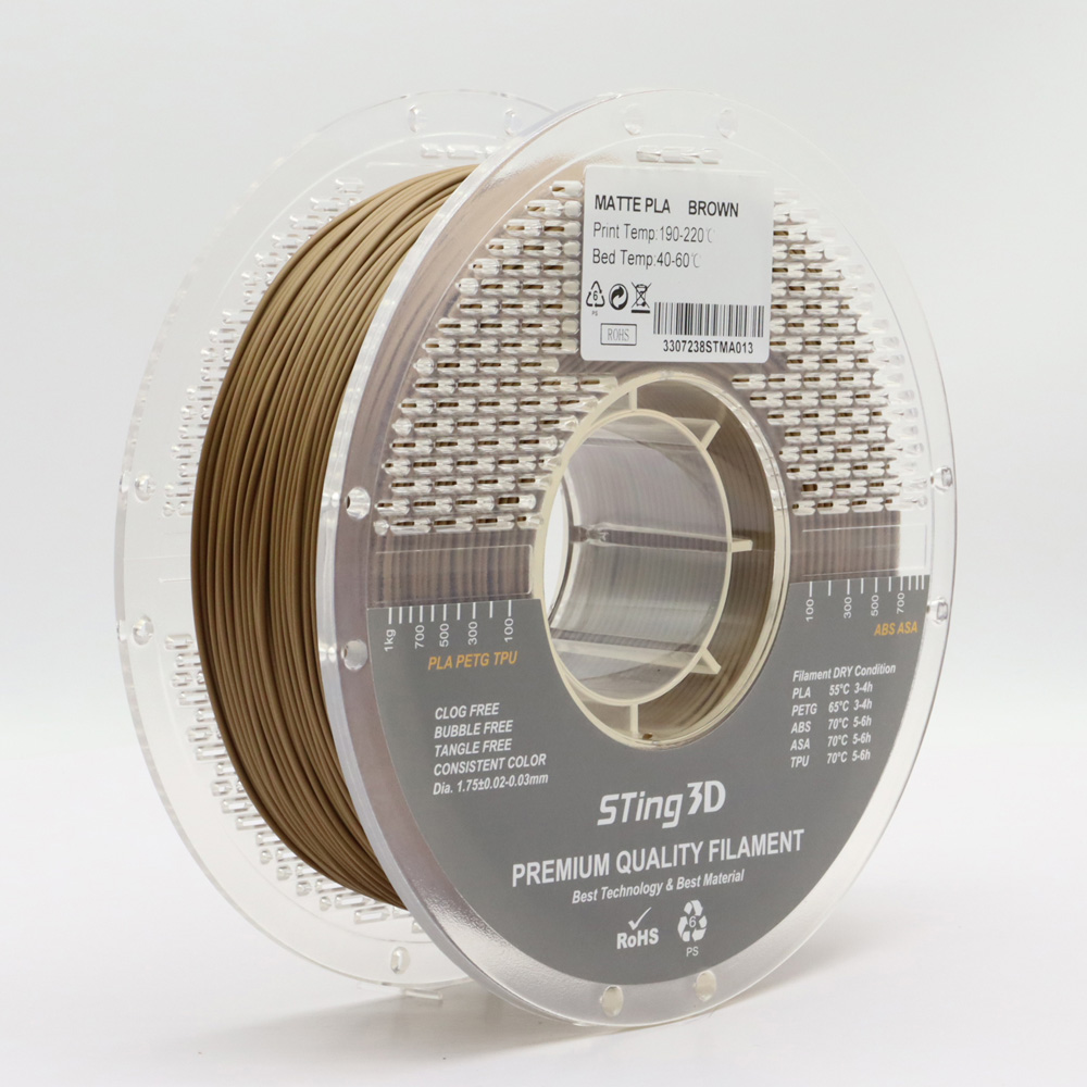 Відкрийте для себе нові горизонти 3D-друку з філаментом STing3D Matte у насиченому коричневому кольорі. Цей PLA пластик поєднує матову текстуру та точність друку, забезпечуючи професійний результат навіть на побутових FDM-принтерах. Ідеально підходить для дизайнерів, інженерів та ентузіастів, які потребують: Глибокий коричневий матовий відтінок для стильних моделей Стабільний