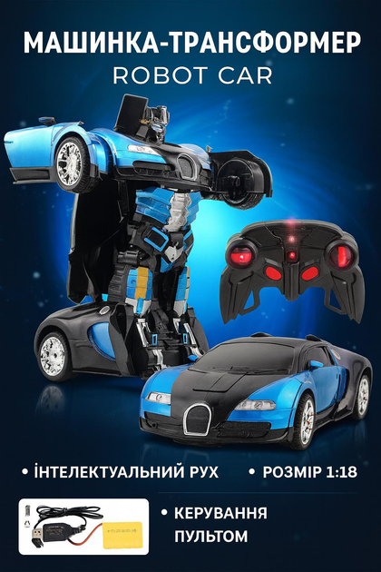 Машинка-трансформер Bugatti Robot Car 1:18 синя з пультом ДУ, акумулятором 700 мА·год, зарядкою та світловими ефектами