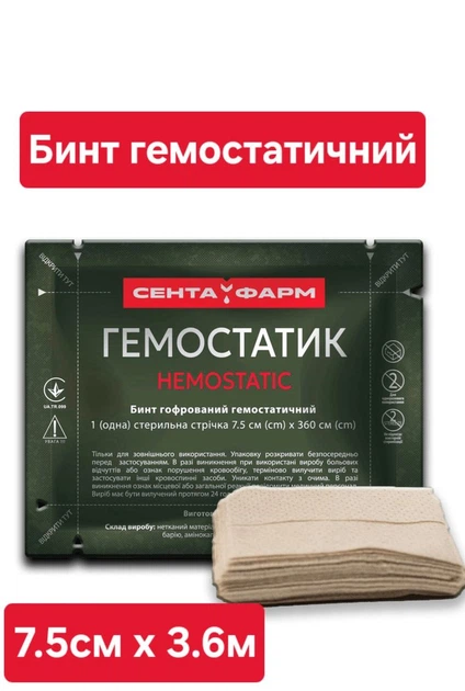 Кровоспинний гемостатичний гофрований бинт 7,5 см х 3,6 м
