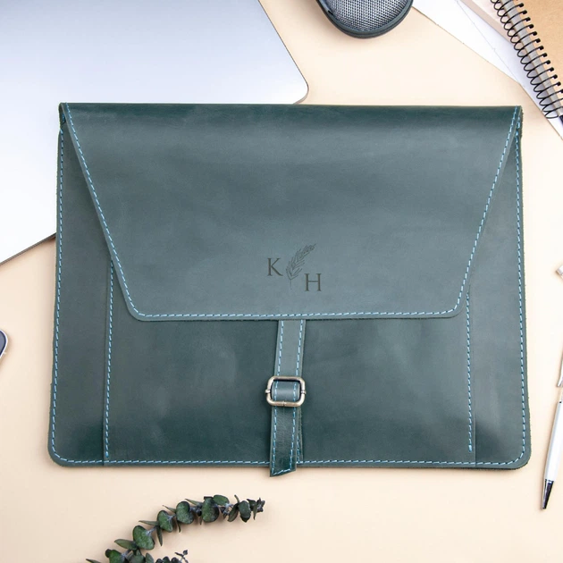 Шкіряна папка з ініціалами, органайзер-папка, Green, Malina Leather