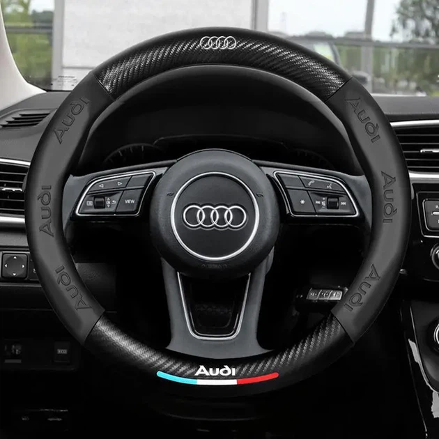 Шкіряний чохол на кермо Audi Sport Brend (37-39см),чорний зі вставкою з вуглеволокна