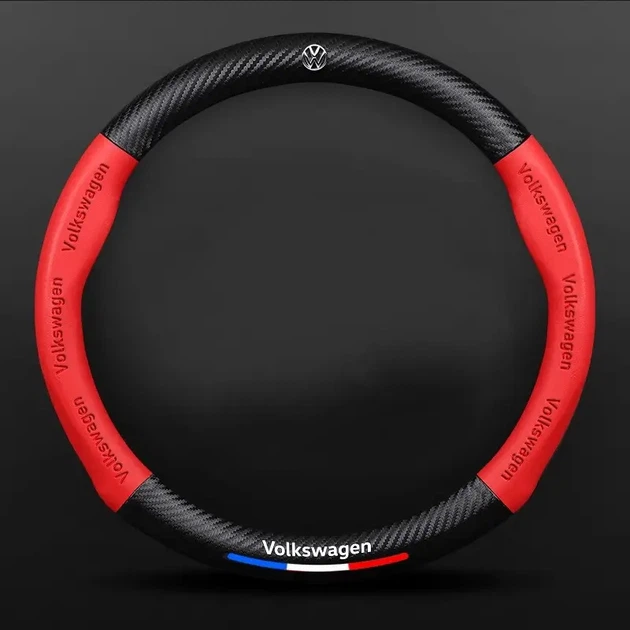 Шкіряний чохол на кермо Volkswagen Sport Brend (37-39см),червоний зі вставкою з вуглеволокна