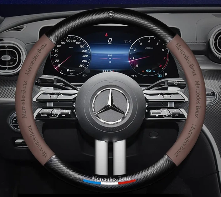 Шкіряний чохол на кермо Mercedes-Benz Sport Brend (37-39см),коричневий зі вставкою з вуглеволокна