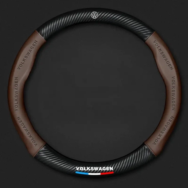 Шкіряний чохол на кермо Volkswagen Sport Brend (37-39см),коричневий зі вставкою з вуглеволокна