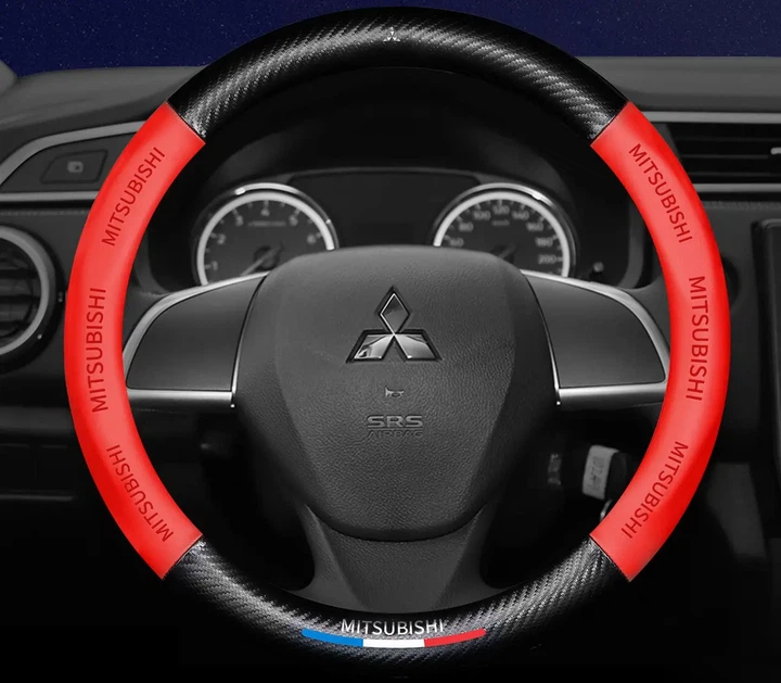 Шкіряний чохол на кермо Mitsubishi Sport Brend (37-39см),червоний зі вставкою з вуглеволокна