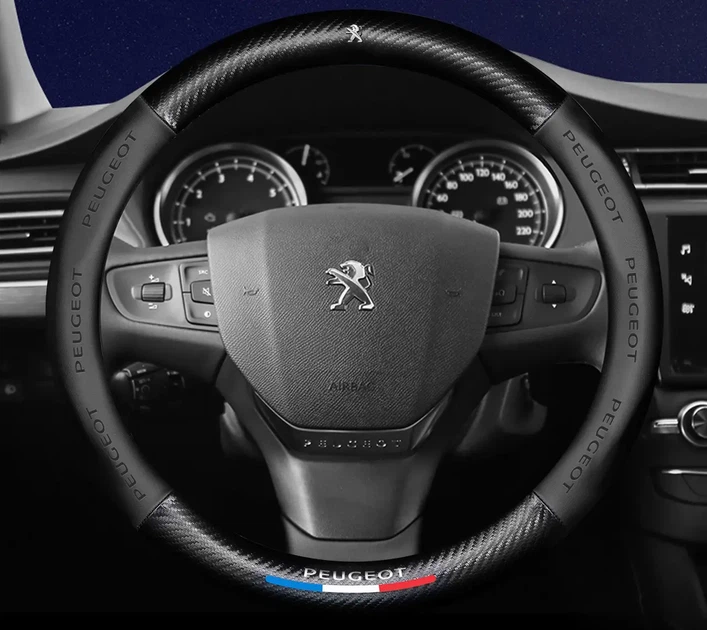 Шкіряний чохол на кермо Peugeot Sport Brend (37-39см),чорний зі вставкою з вуглеволокна
