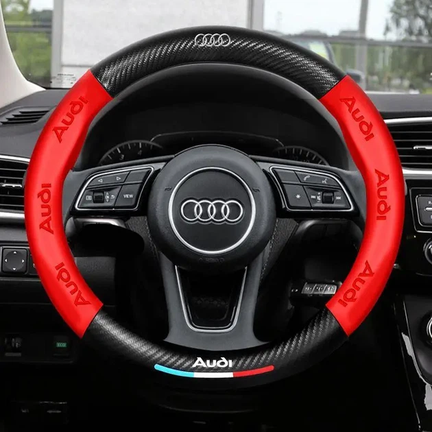 Шкіряний чохол на кермо Audi Sport Brend (37-39см),червоний зі вставкою з вуглеволокна
