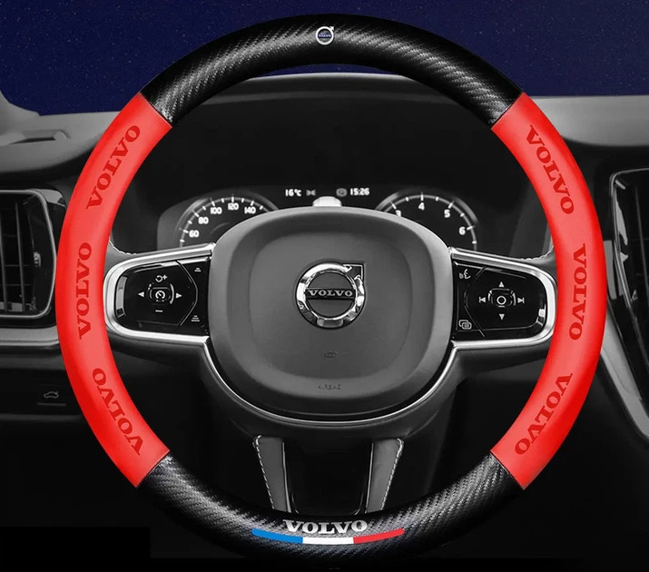Шкіряний чохол на кермо Volvo Sport Brend (37-39см),червоний зі вставкою з вуглеволокна