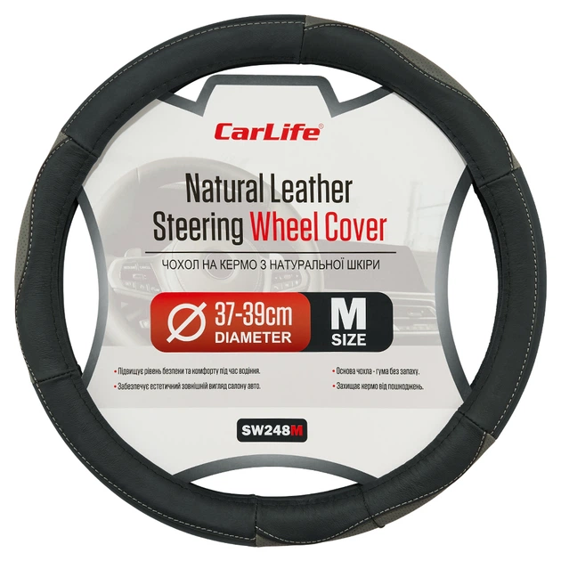 Чохол на кермо Carlife 37-39см, шкіра, чорний з сірими вставками SW248M