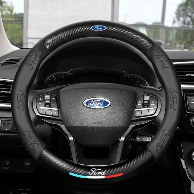 Шкіряний чохол на кермо Ford Sport Brend (37-39см),чорний зі вставкою з вуглеволокна