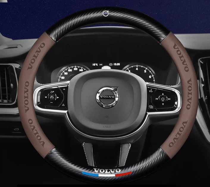 Шкіряний чохол на кермо Volvo Sport Brend (37-39см),коричневий зі вставкою з вуглеволокна