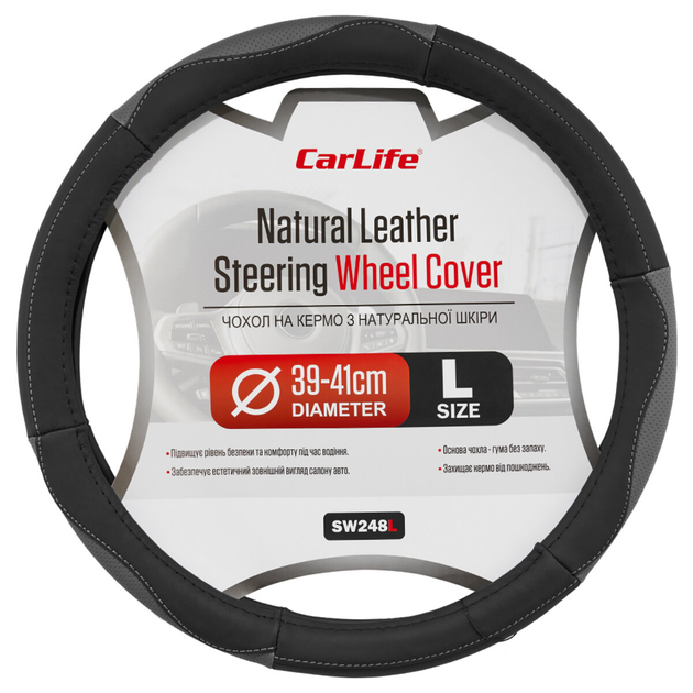 Чохол на кермо Carlife 39-41см шкіряний чорний із сірими вставками для автомобіля протиковзкий захисний (1LO-TH11C)