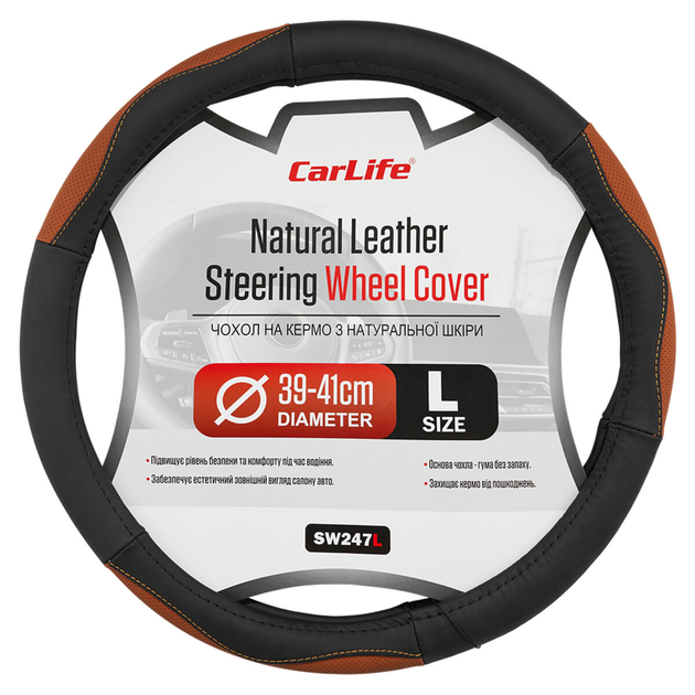 Чохол на кермо Carlife 39-41см чорний з коричневими вставками шкіряний для автомобіля протиковзкий захисний (1LO-TH11C)