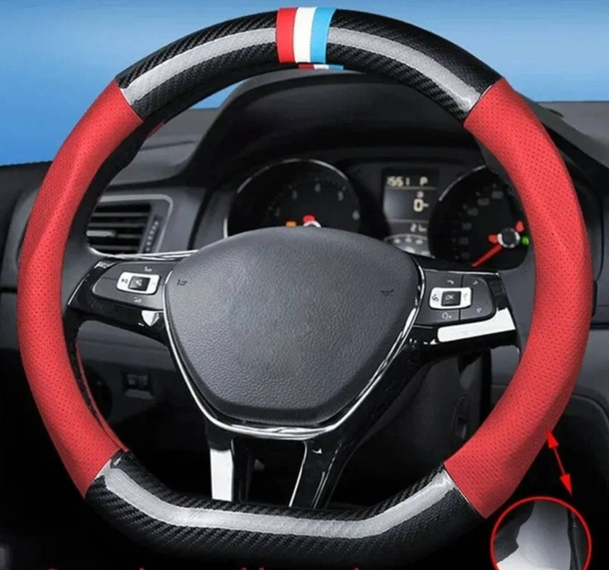 Чохол на кермо шкіра + Карбон D-подібний. Червоний всезезонний