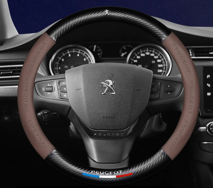 Шкіряний чохол на кермо Peugeot Sport Brend (37-39см),коричневий зі вставкою з вуглеволокна