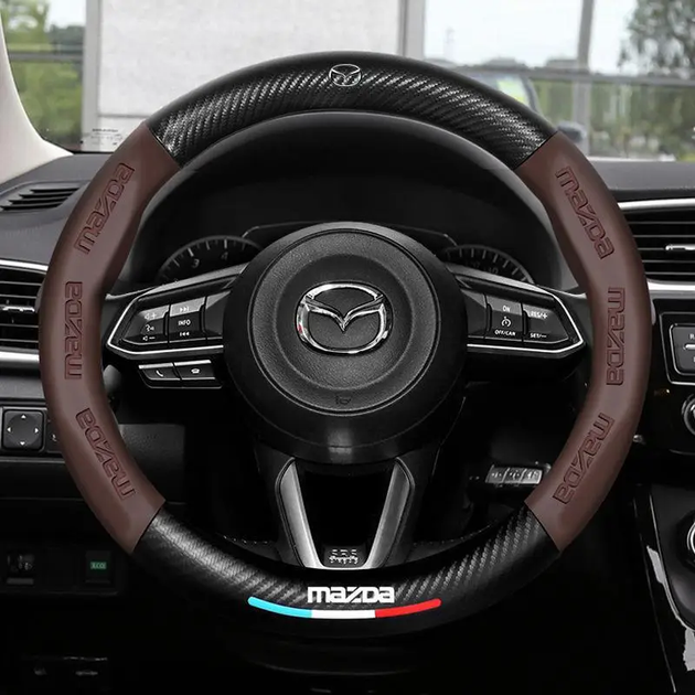 Шкіряний чохол на кермо Mazda Sport Brend (37-39см),коричневий зі вставкою з вуглеволокна