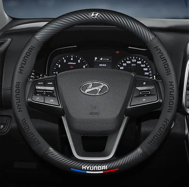 Шкіряний чохол на кермо Hyundai Sport Brend (37-39см),чорний зі вставкою з вуглеволокна