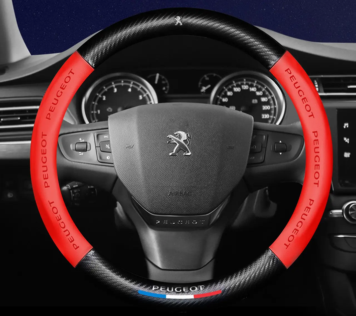 Шкіряний чохол на кермо Peugeot Sport Brend (37-39см),червоний зі вставкою з вуглеволокна