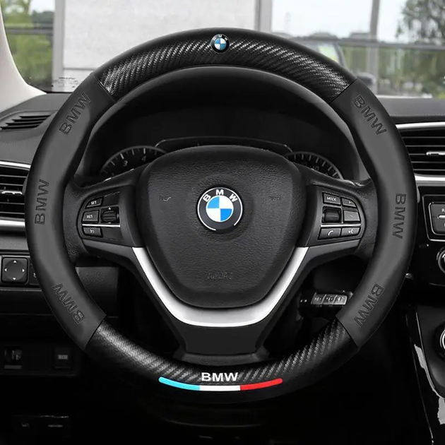 Шкіряний чохол на кермо BMW Sport Brend (37-39см),чорний зі вставкою з вуглеволокна